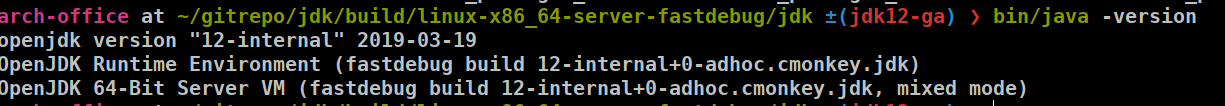 而有了自定义编译的jdk12-GA版本,就可以将linux-x86_64-server-fastdebug 这个目录copy 到其它地方,然后设置编译的jdk 为JAVA_HOME的目录